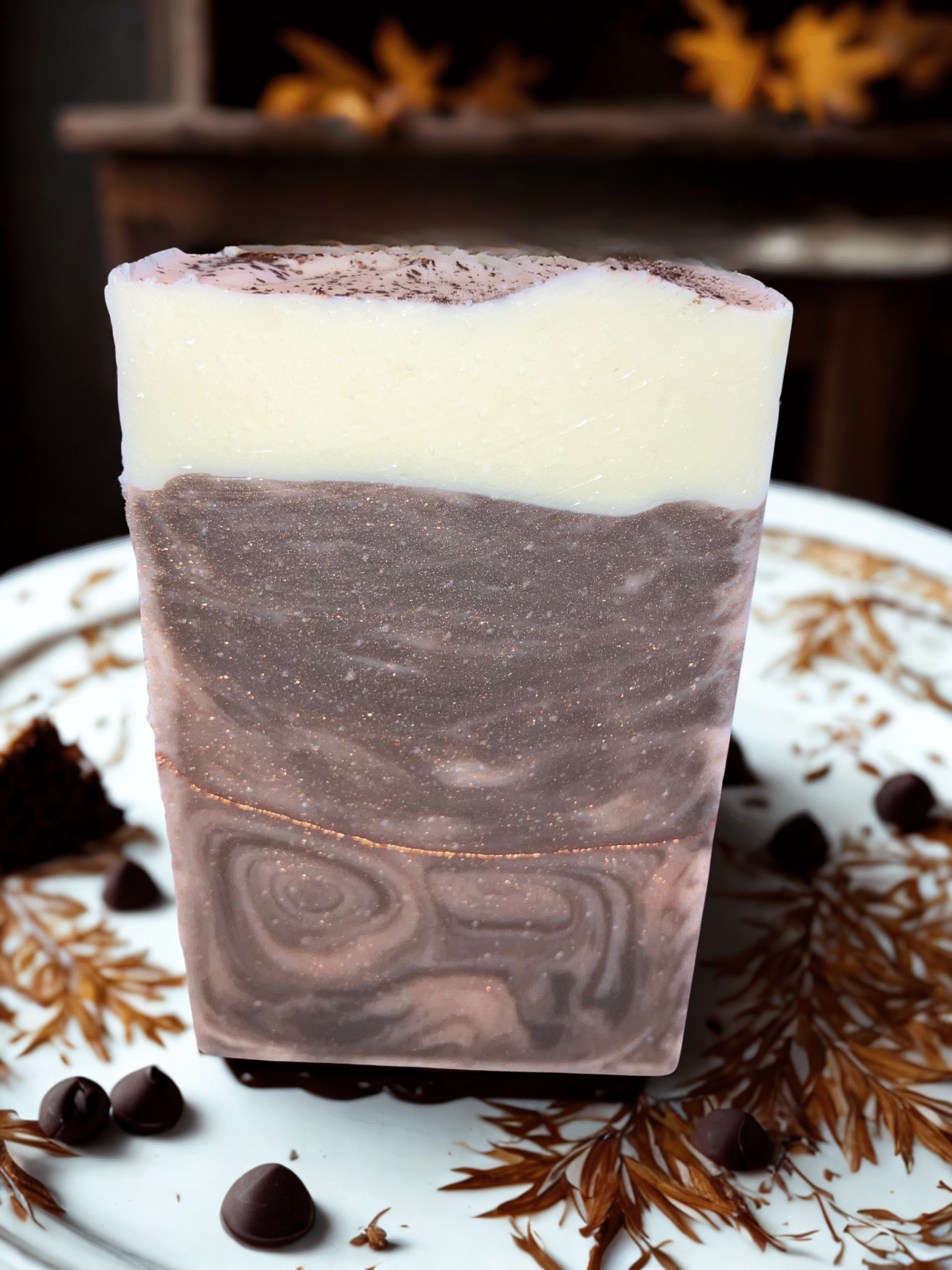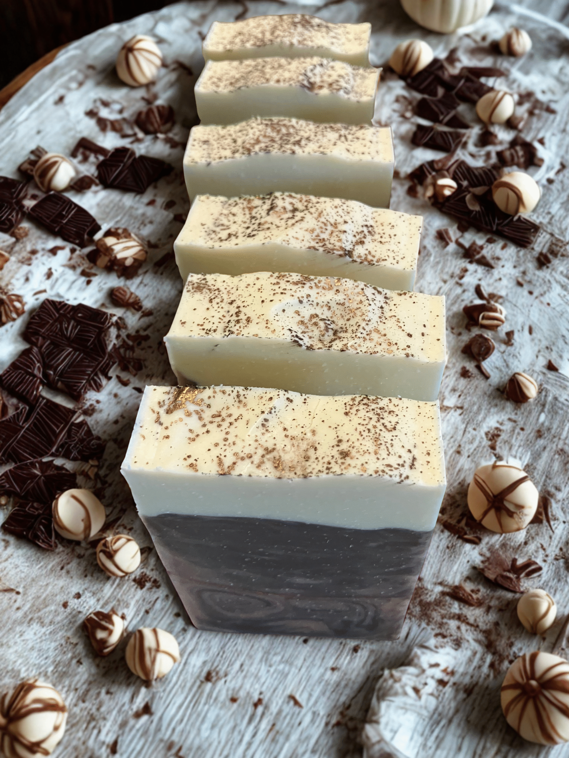 Wrap your senses in the comfort of a mug full of chai and a heart full of peace. This creamy tallow soap is swirled in shades of warm brown and ivory, kissed with a dusting of shimmer that resembles cinnamon sprinkled on cream. Scented entirely with pure essential oils, this blend captures the soul of a cozy chai – coffee, cinnamon, clove, nutmeg, and a hint of vanilla warmth.